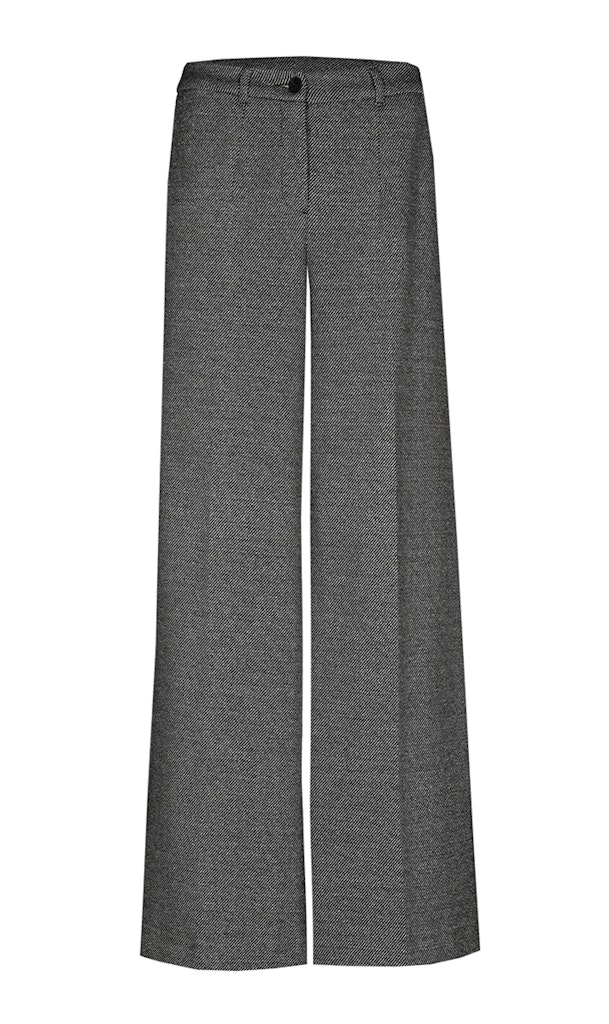 Gemêleerde broek van Xandres met wijde pijpen, twee steekzakken, twee paspelzakken aan de achterzijde en een knoop- en ritssluiting.