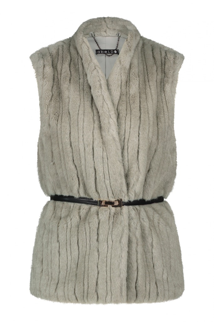 Imitatie bont bodywarmer van Label Dot in een gestreept structuur, sjaalkraag en een ceintuur in de taille. Materiaal: Polyester 100%