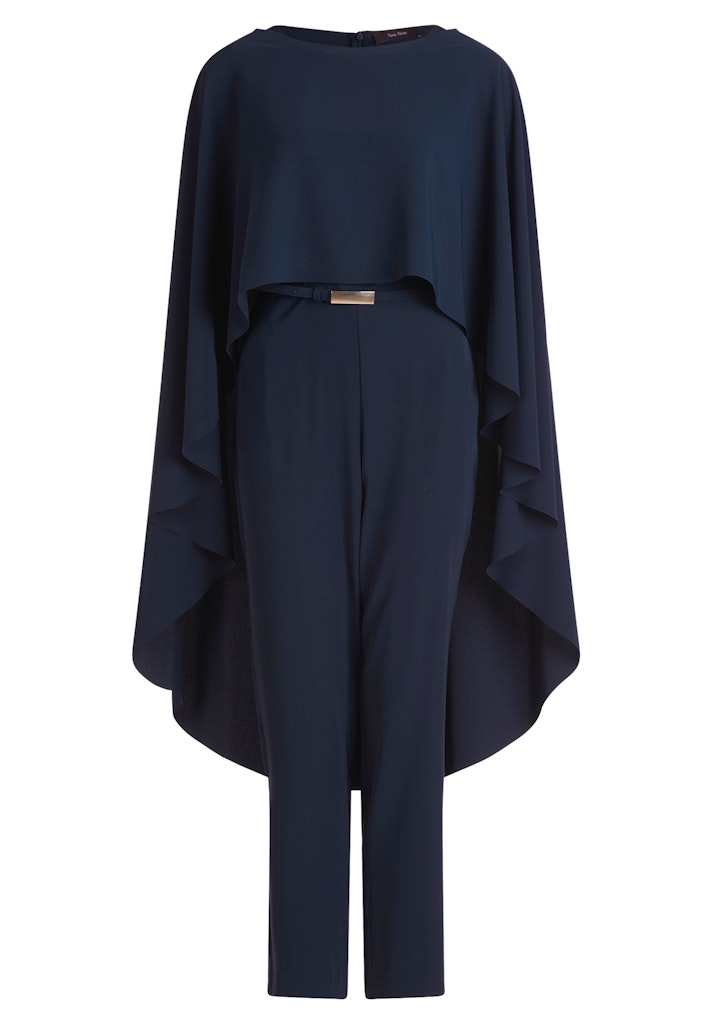 Enkellange, crêpe jumpsuit van Vera Mont met volantmouwen, boothals, steekzakken en een elastische tailleband voorzien van ceintuur. Materiaal: Polyester 100%
