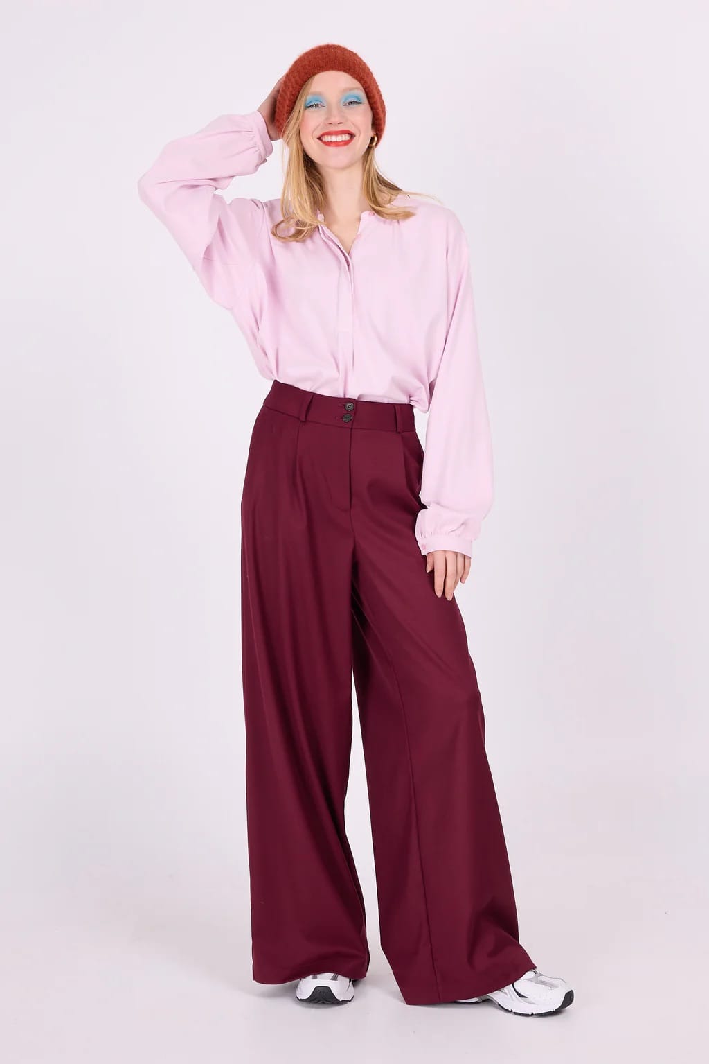 Broek van Nathalie Vleeschouwer met wijde pijpen, dubbele knoop- en ritssluiting, bandplooien, steekzakken en twee klepzakken aan de achterzijde.