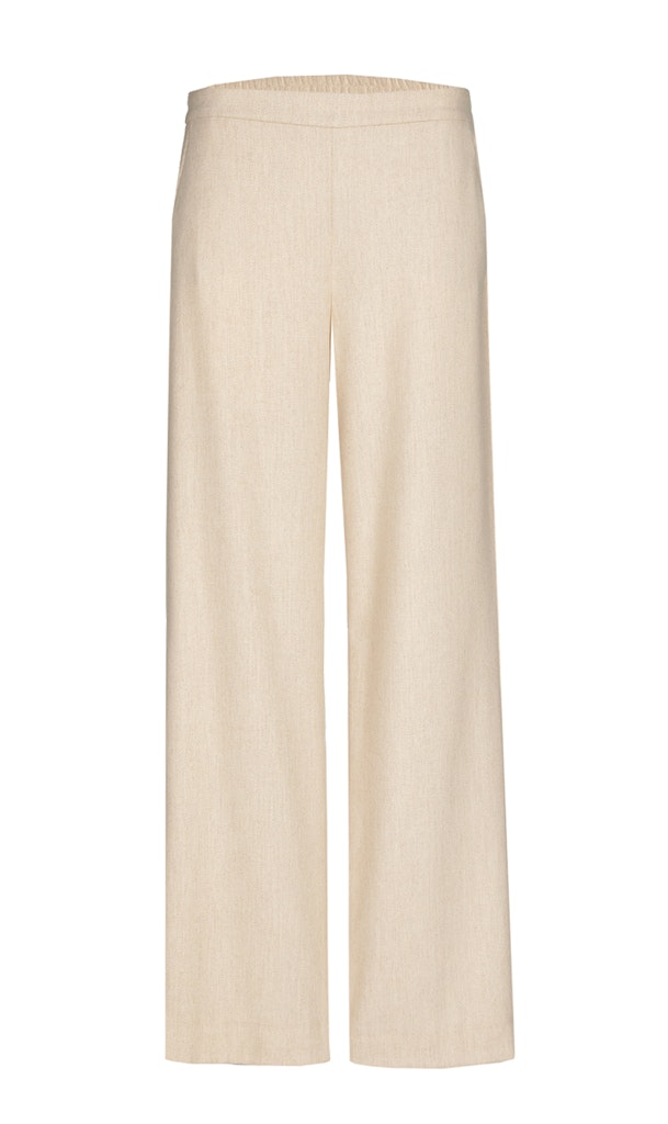 Broek van Xandress met wijde pijpen, steekzakken, opgestikte klepzakken aan de achterzijde en een elastische tailleband.