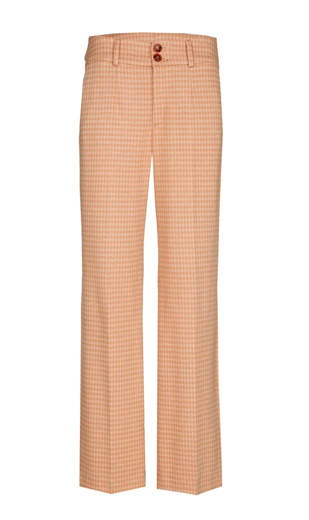 Broek van Xandress in een fijne ruit dessin met wijde pijpen, dubbele knoop- en ritssluiting, steekzakken en twee paspelzakken aan de achterzijde.