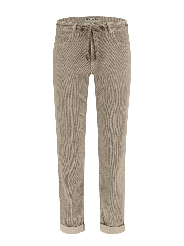 5-pocket corduroy broek van Para Mi met een hoge taille, omgeslagen pijpen, decoratief gevlochten koord en een knoop- en ritssluiting.