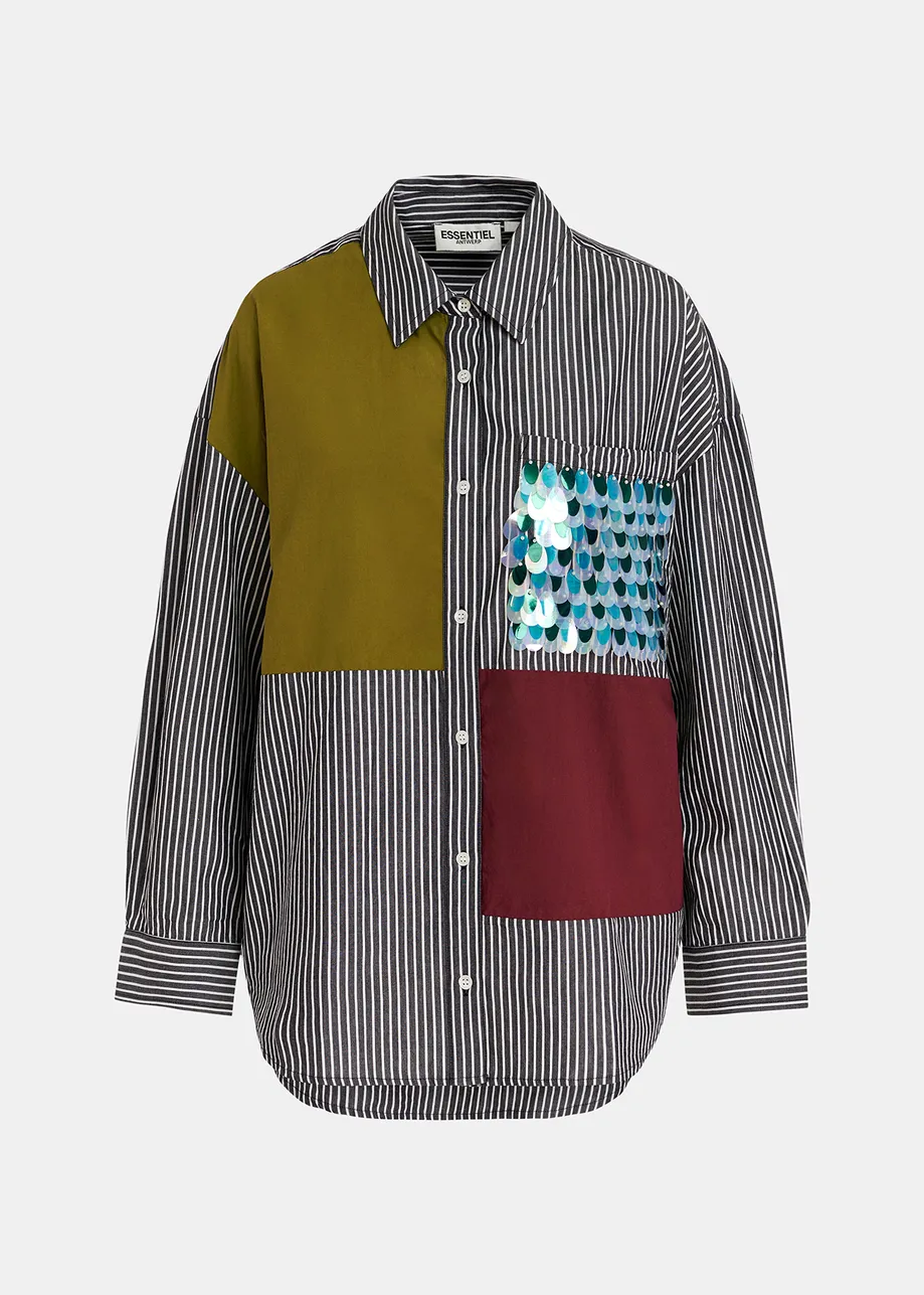 Gestreepte blouse van Essentiel Antwerp met felgekleurde inzetstukken, borstzak met pailletten, lange mouwen, verlaagde schoudernaden, kraag en knoopsluiting.