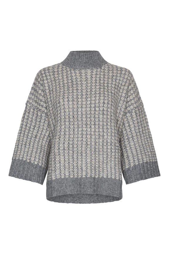 Structuur gebreide pullover van HET! Amsterdam met driekwart mouwen, verlaagde schoudernaden en opstaande kraag. Materiaal: Alpaca wol 100%