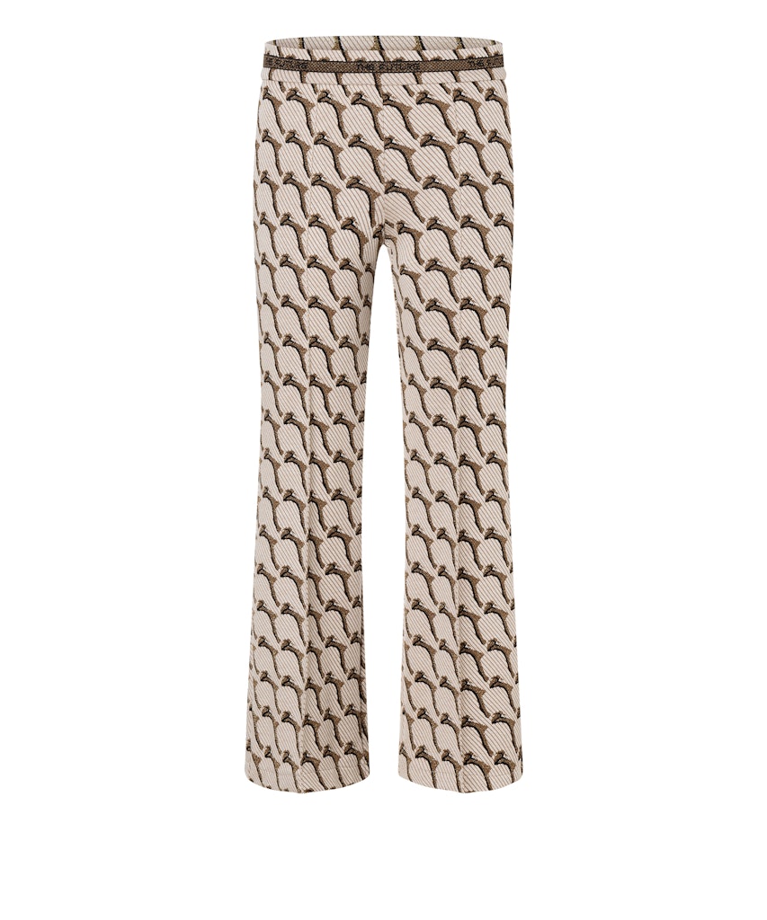 Broek van Cambio in een all-over dessin met wijde pijpen en een glitter ceintuur. Materiaal: Polyamide 38%| viscose 35%| polyester 23%| elastan 4%