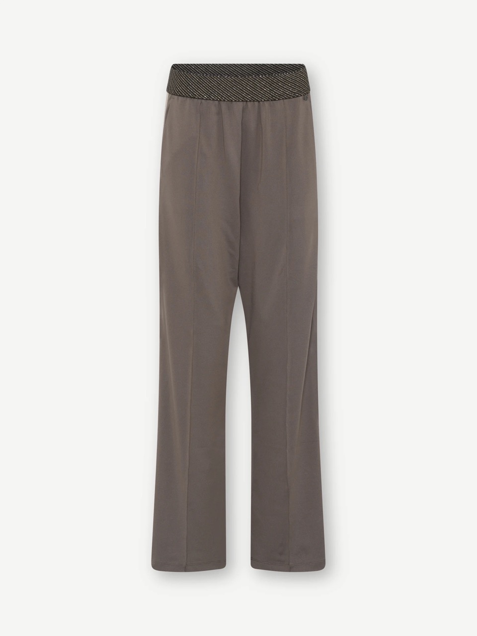Broek van Gustav met twee steekzakken, rechte pijpen en een brede glinsterende elastische tailleband. Materiaal: Polyester 85%| elastan 15%