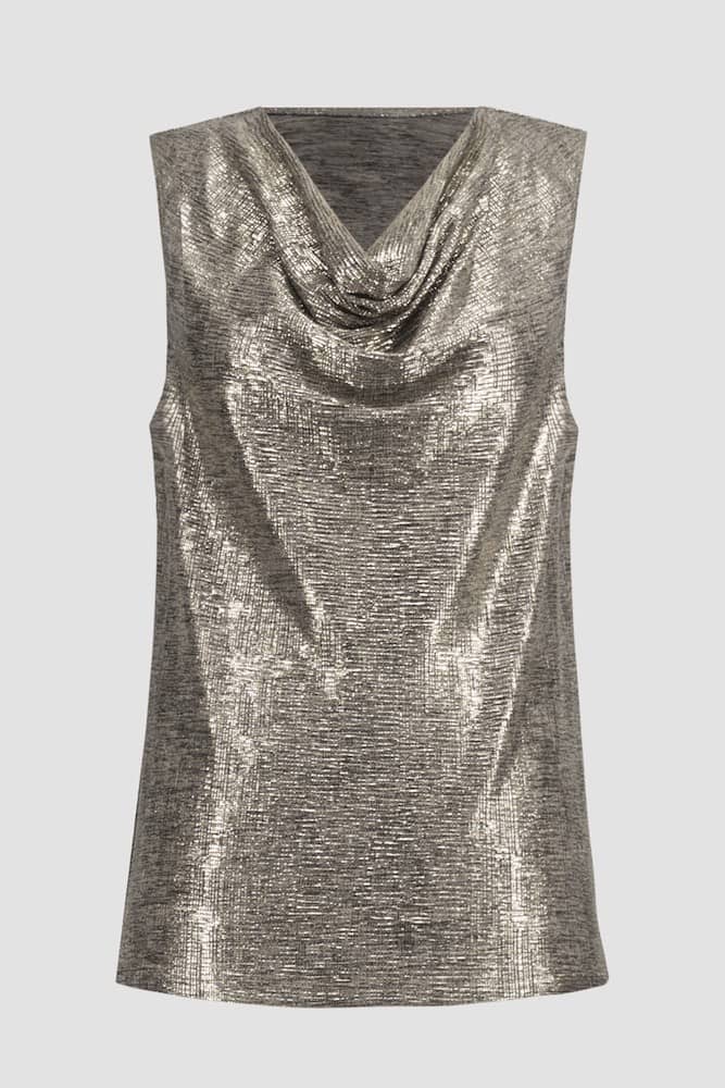 Mouwloze top van Joseph Ribkoff in een glanzend gemêleerd dessin met een waterval hals. Materiaal: Polyester 95%| spandex 5%