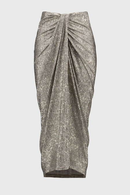 Metallic midi rok van Joseph Ribkoff in een structuur dessin met gerimpelde- en geknoopte details, hoge taille en een elastische tailleband.