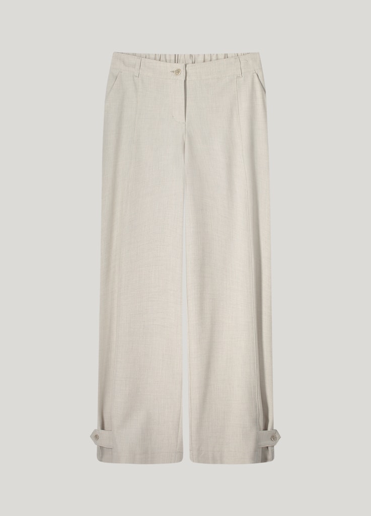 Broek van Summum met wijde pijpen, knoop- en ritssluiting, elastische tailleband aan de achterzijde, steekzakken, klepzakken aan de achterzijde en verstelbare gesp onderaan de pijpen. Materiaal: Polyester 64%| viscose 31%| elastan 5%