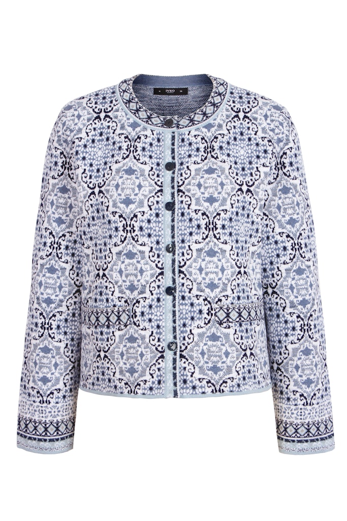 Vest van Ivko Woman in een all-over dessin met lange mouwen, ronde hals, knoopsluiting en twee paspelzakken.