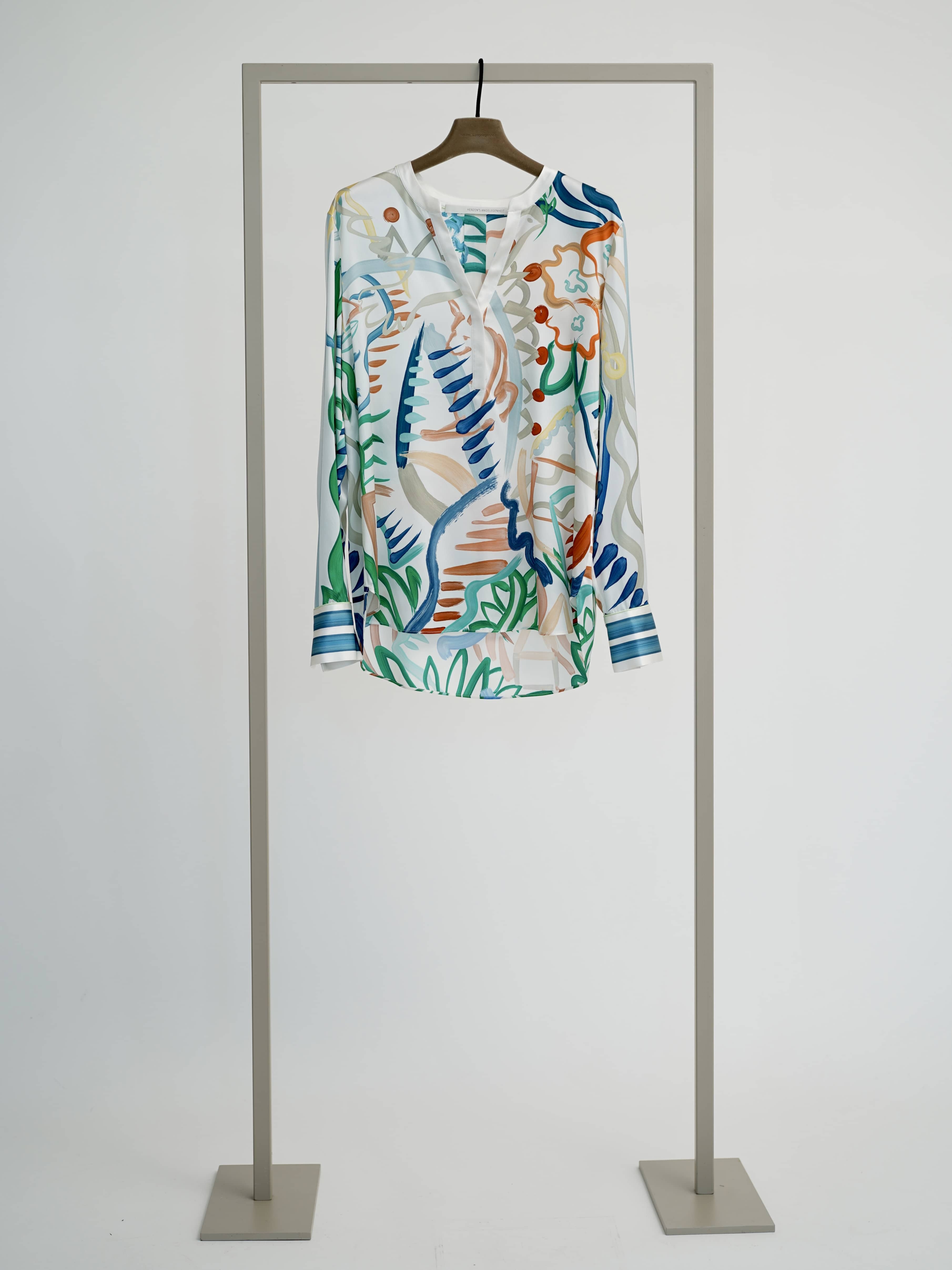 Zijden blouse van Herzen's Angelegenheit in een all-over dessin met lange mouwen, decoratieve V-hals en een iets langere achterzijde.