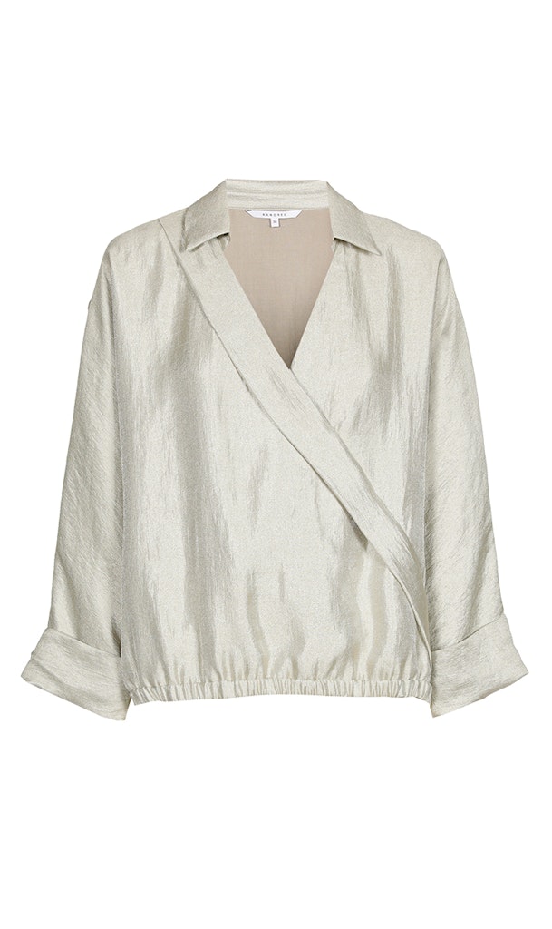 Glanzende blouse van Xandres met lange mouwen voorzien van omslag, kraag, V-hals voorzien van overslag en een elastische zoom.
