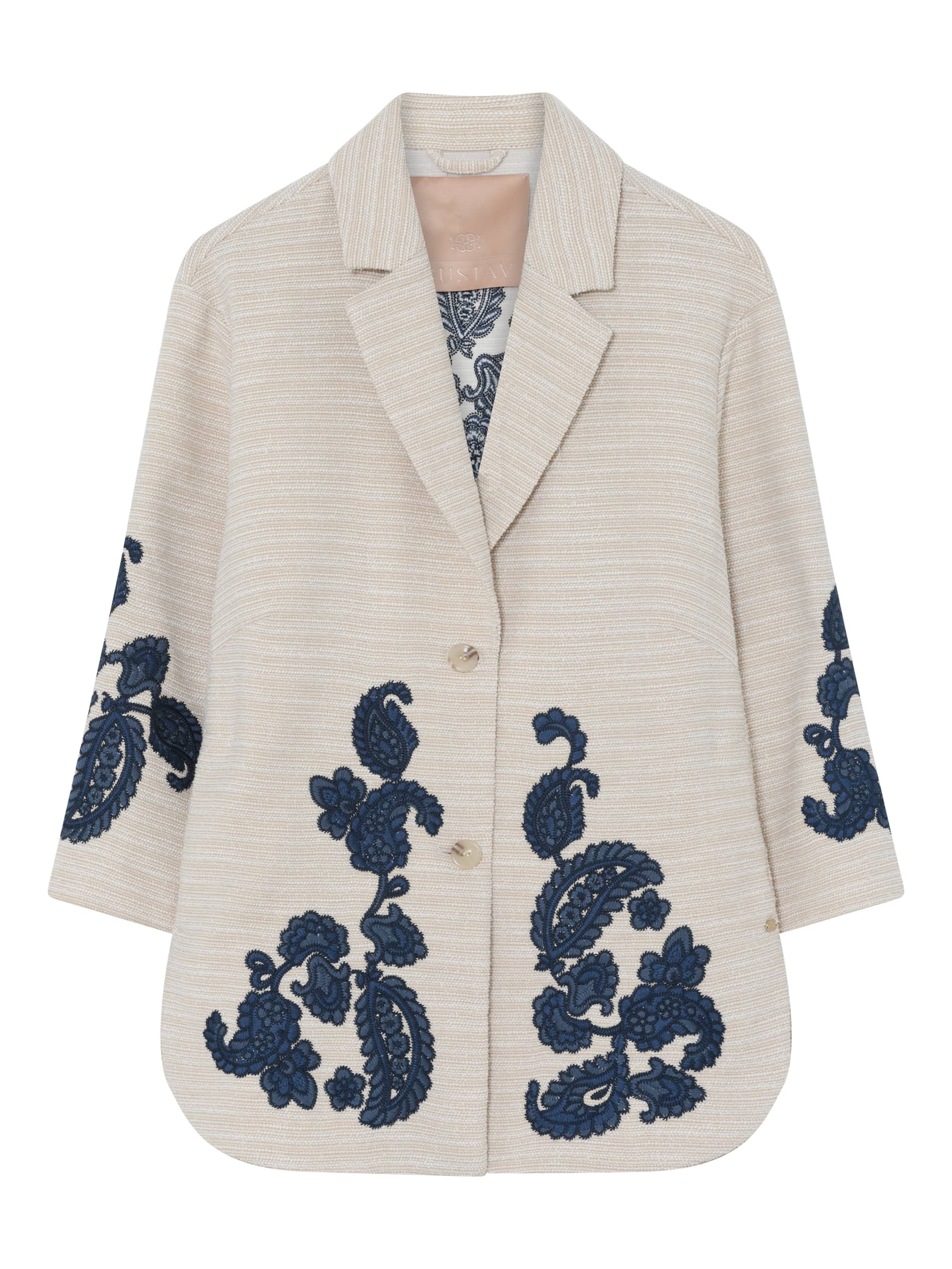 Blazer van Gustav in een structuur dessin voorzien van geborduurde details, 7/8 mouwen, reverskraag, knoopsluiting en een afgeronde onderzijde.