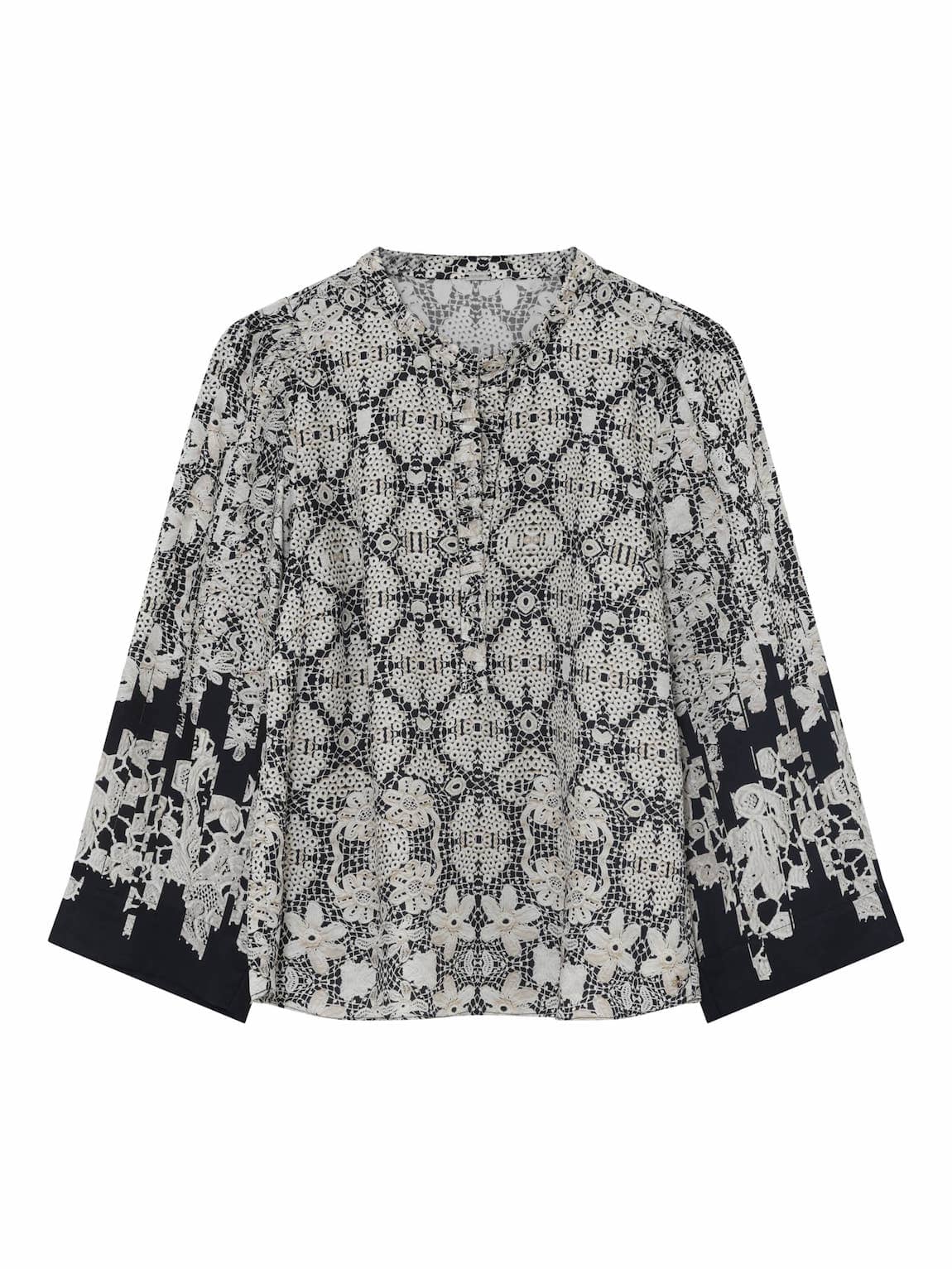 Blouse van Gustav in een all-over dessin voorzien van borduursels met lange wijde mouwen, ronde hals en een knoopsluiting.