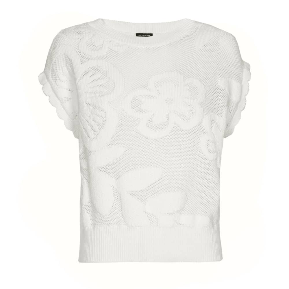 Top van Caroline Biss in structuurstof met bloemdessin, korte mouwen voorzien van een golvende boord, ronde hals en ribboorden. Materiaal: Katoen 85%| polyamide 13%| polyester 2%.