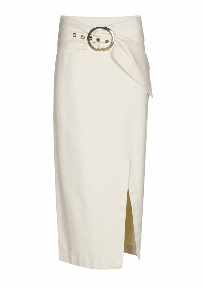 Aansluitende rok van Caroline Biss met een blinde ritssluiting in de zijnaad, ceintuur in de taille en een split aan de voorzijde.