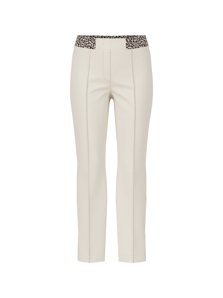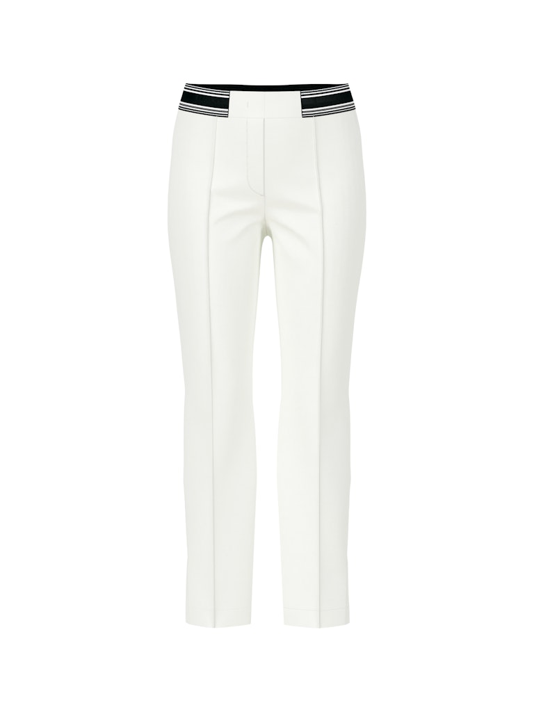 Enkellange slim fit broek van Marc Cain Sports met een verborgen knoop- en ritssluiting, doorgestikte vouw aan de voorzijde, paspelzakken aan de achterzijde, korte split in de pijpen en een gestreepte elastische tailleband. Materiaal: Bio katoen 50%| gerecycled polyester 47%| elastan 3%