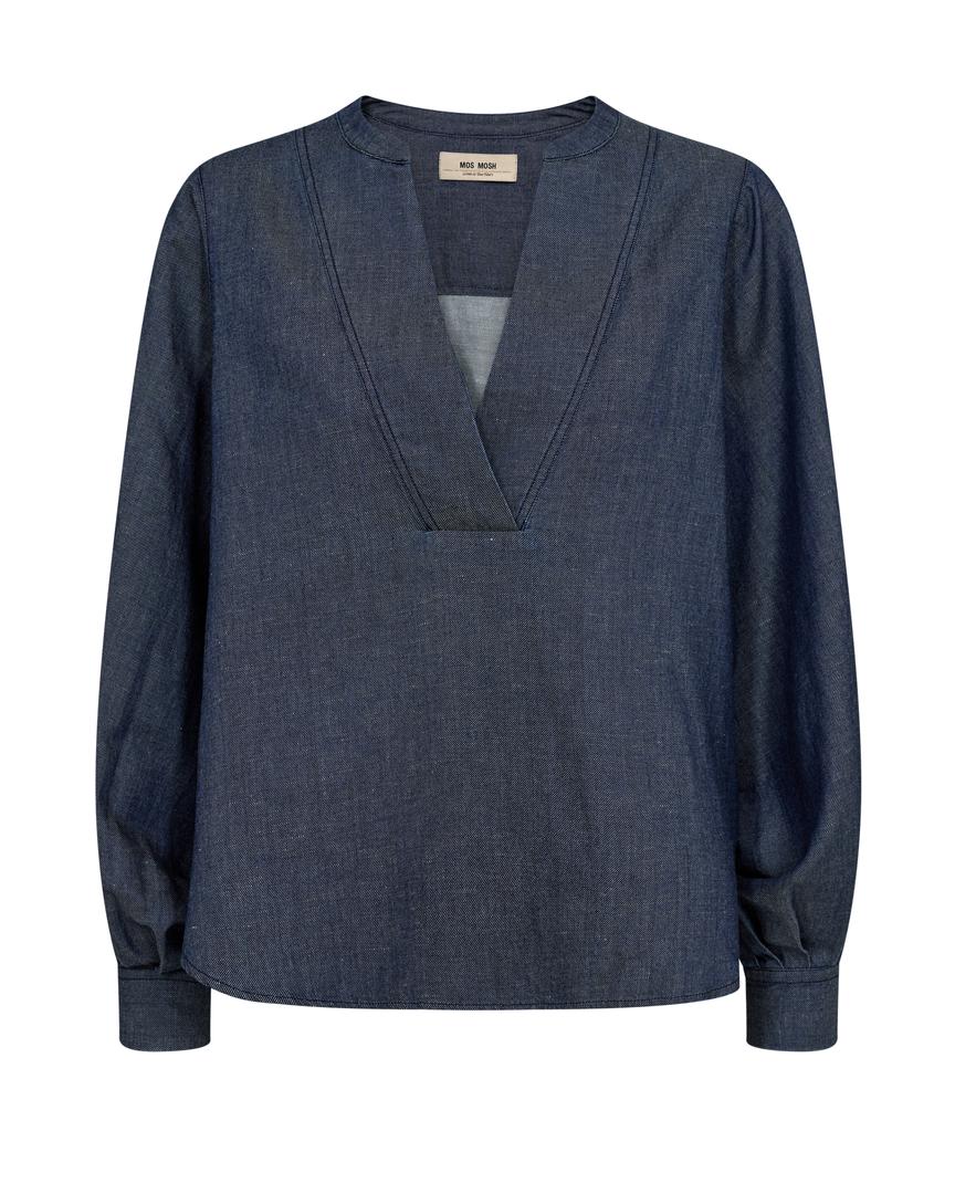 Denim blouse van Mos Mosh met lange pofmouwen en een diepe V-hals. Materiaal: Katoen 50%| lyocell 25%| linnen 25%