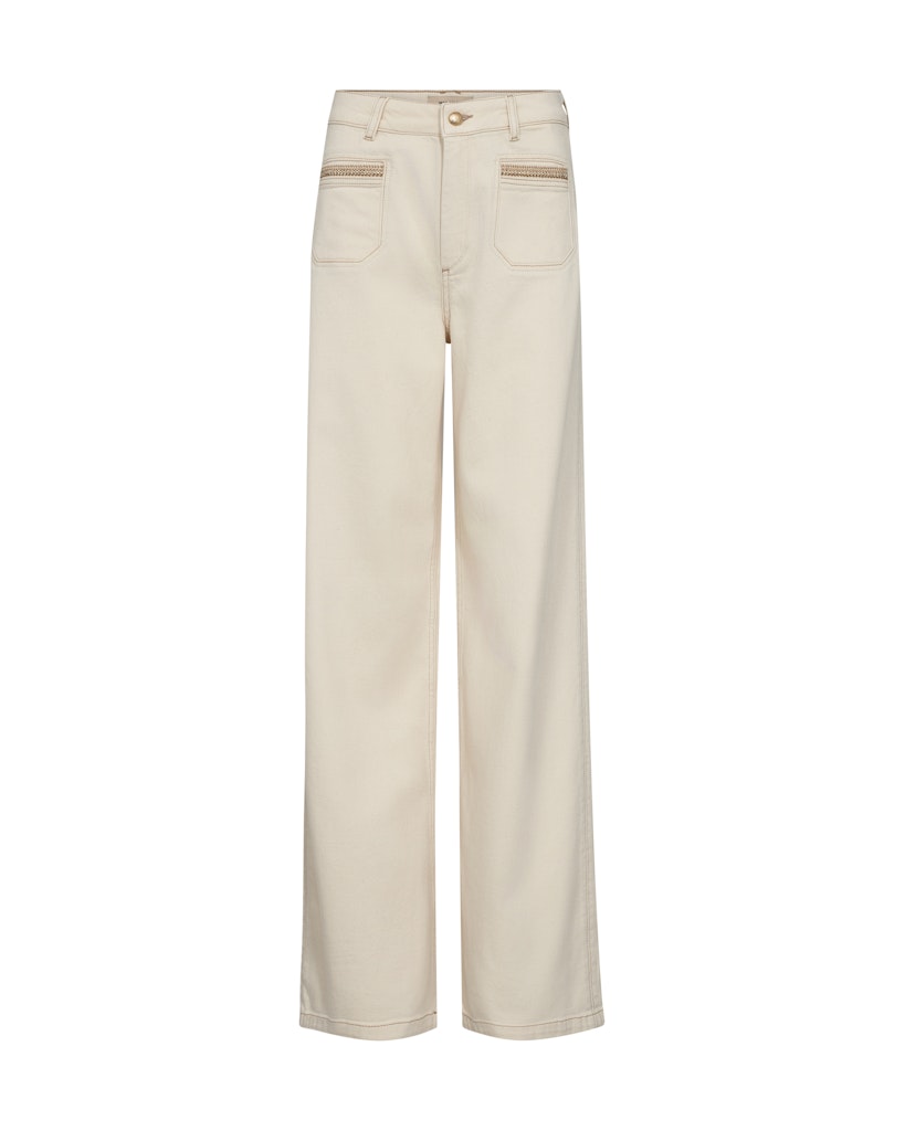 Jeans van Mos Mosh met wijde pijpen, knoop- en ritssluiting, hoge taille, opgestikte voorzakken voorzien van contrasterende details en twee paspelzakken aan de achterzijde. Materiaal: Katoen 98%| elastan 2%