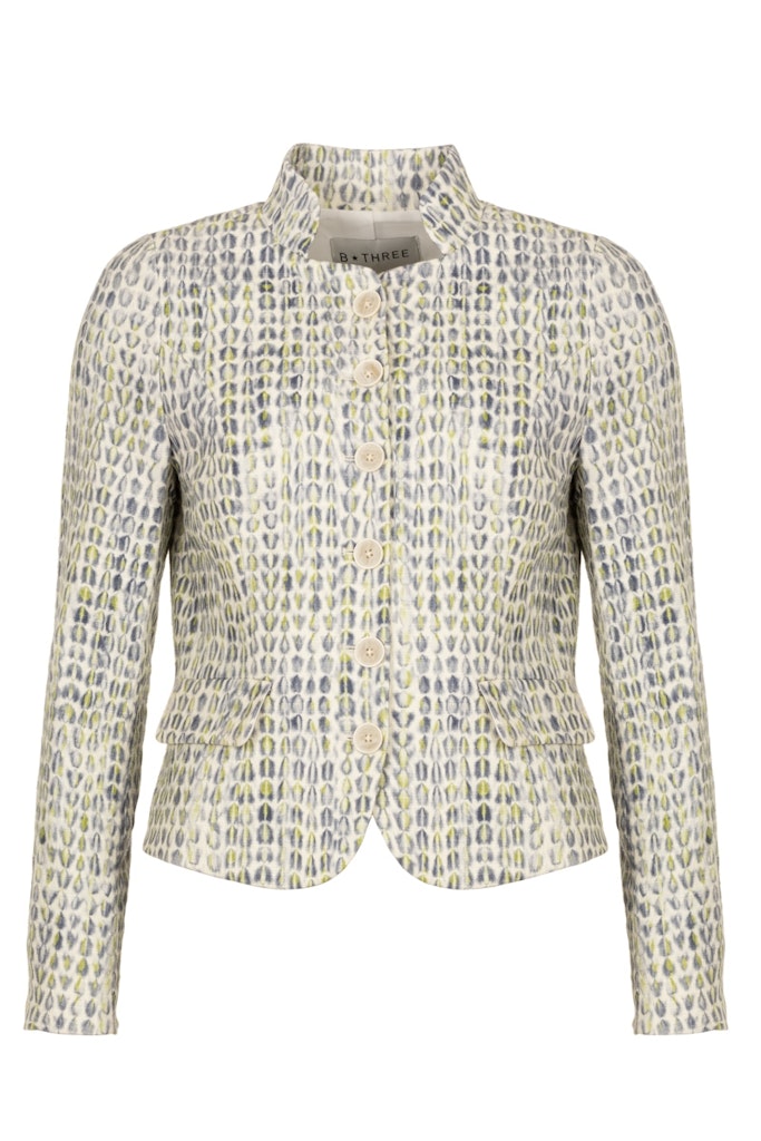 Blazer van B Three in een all-over dessin met lange mouwen, opstaande reverskraag, knoopsluiting en twee klepzakken.