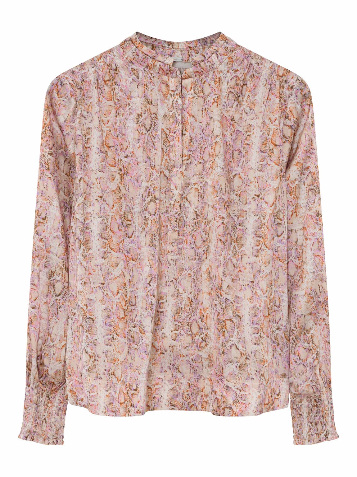 Blouse van Gustav in een all-over dessin met lange mouwen voorzien van gesmokte manchetten, opstaande kraag, V-hals en plooien aan de schouders.
