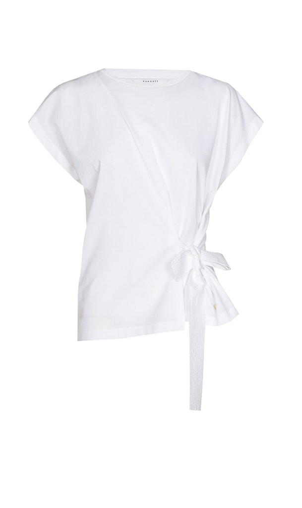Top van Xandres met korte aangeknipte mouwen, ronde hals en een strikdetail in de taille. Materiaal: Organisch katoen 100%