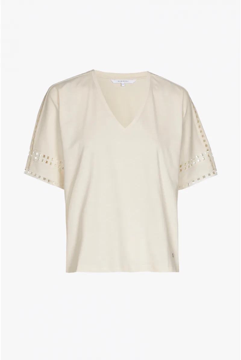 T-shirt van Xandres met een V-hals en korte mouwen met opengewerkte details. Materiaal: Organic katoen 100%