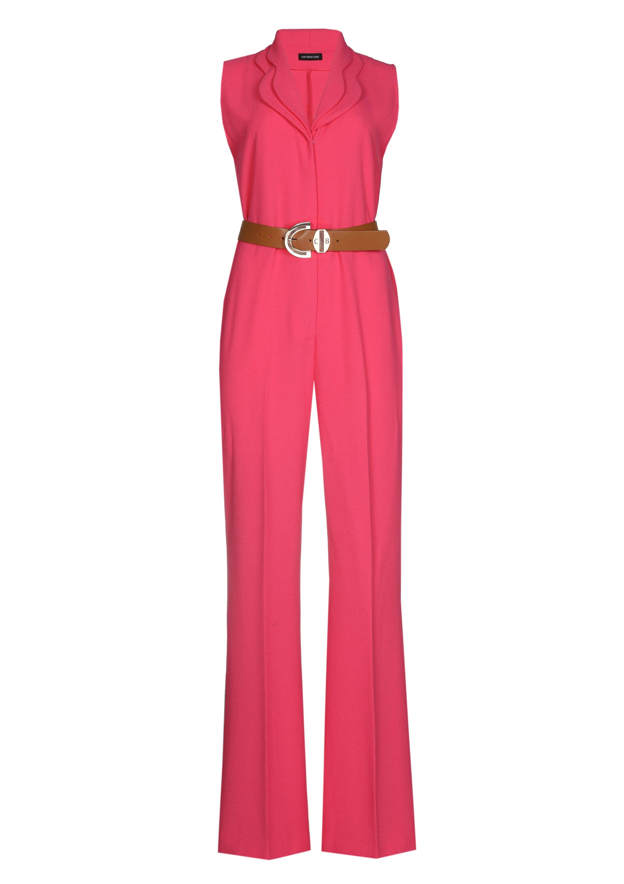 Mouwloze jumpsuit van Caroline met een verborgen ritssluiting, reverskraag, steekzakken, wijde pijpen, steekzakken en een ceintuur in de taille.