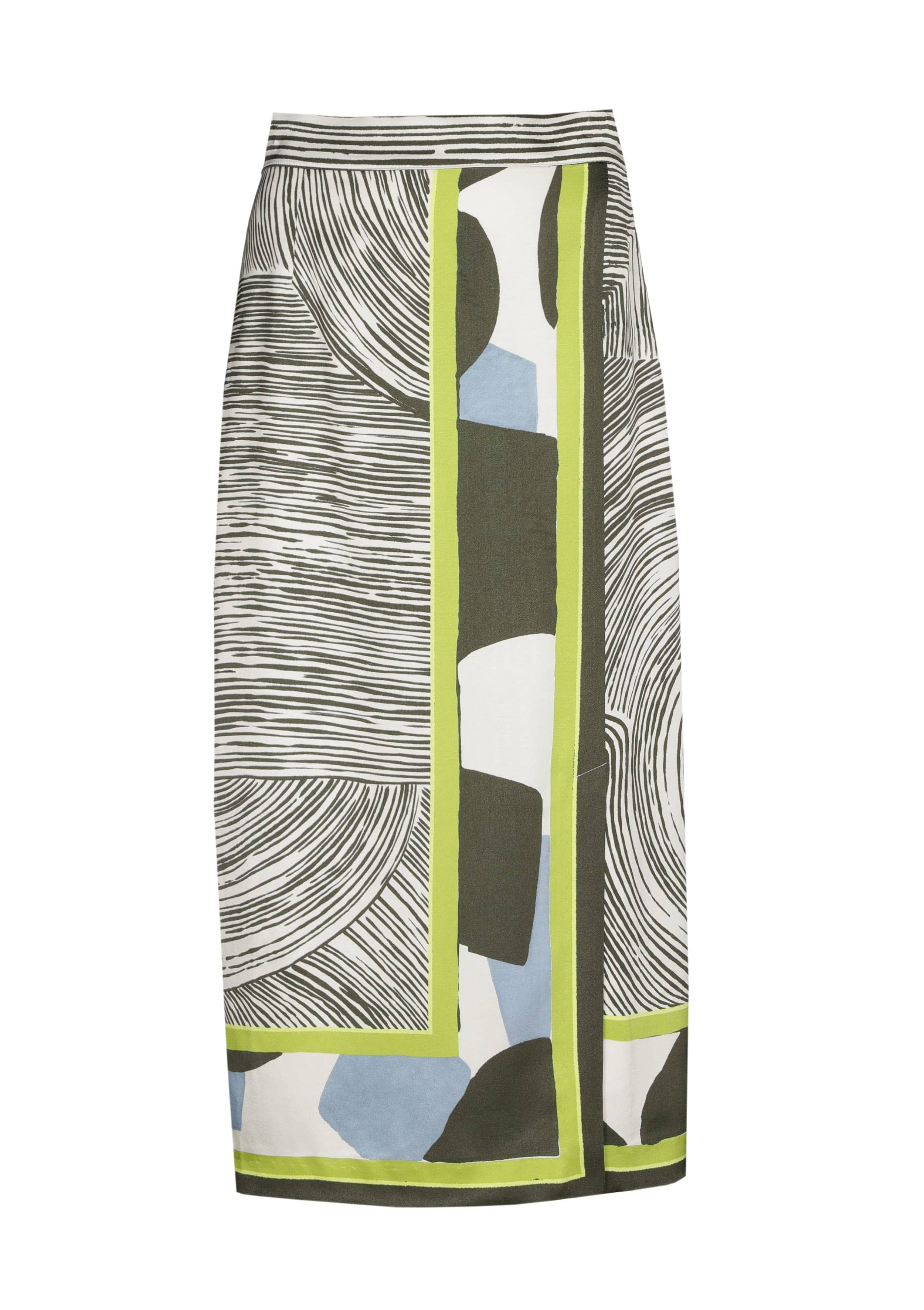 Rechte satijnen rok van Caroline Biss in een all-over dessin met een verborgen ritssluiting in de zijnaad en een split middenvoor.