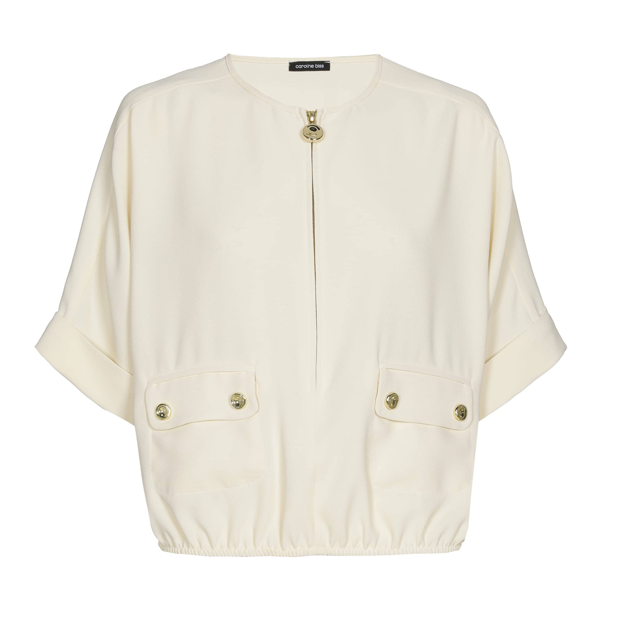 Losvallende blouse van Caroline Biss met korte aangeknipte mouwen, voorzien van omslag ronde hals, halve ritssluiting, twee opgestikte klepzakken en een elastische zoom.