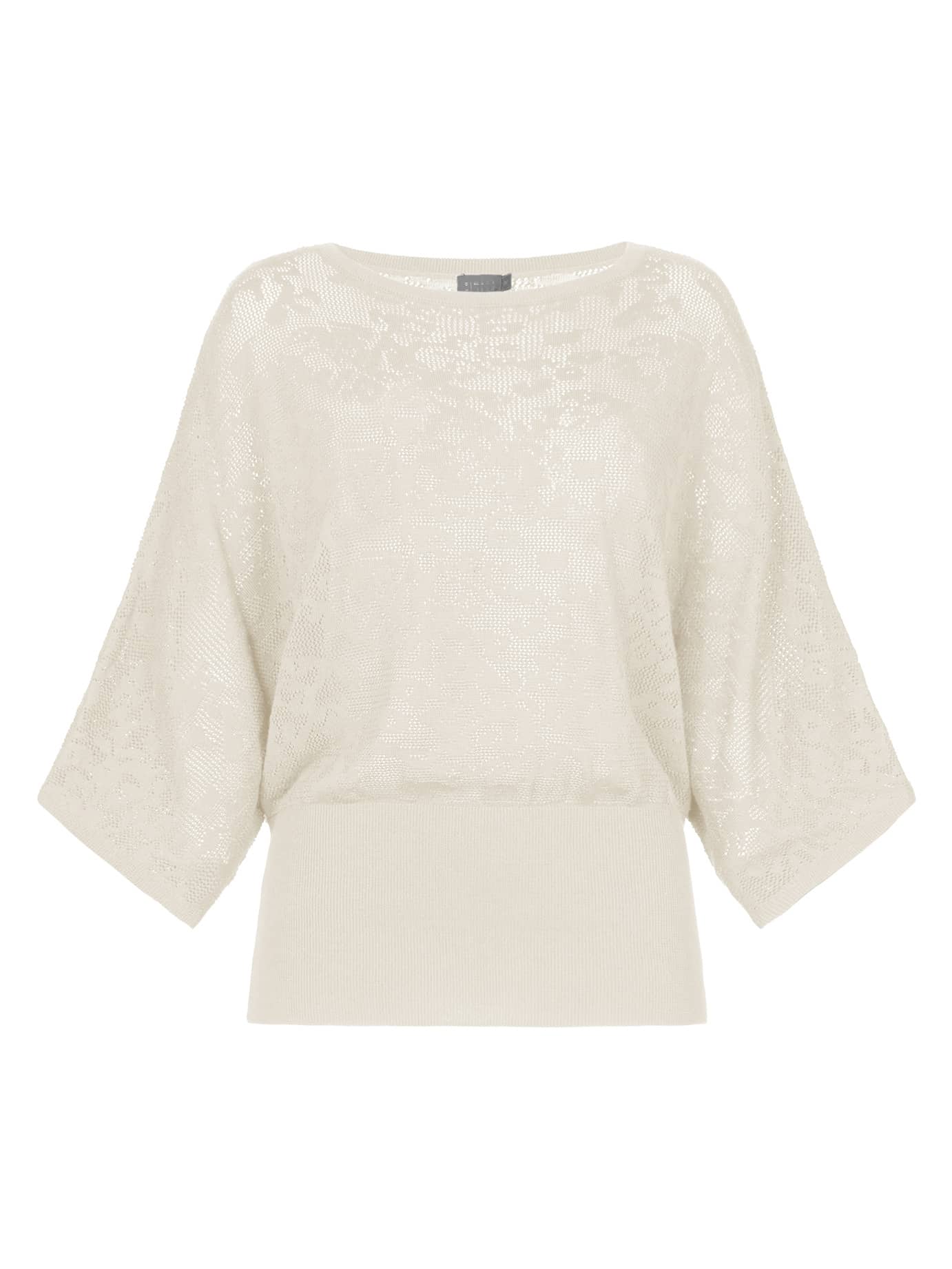 Licht opengewerkte trui van No Man's Land met een dessin, halflange vleermuis mouwen, ronde hals en een brede tailleband.