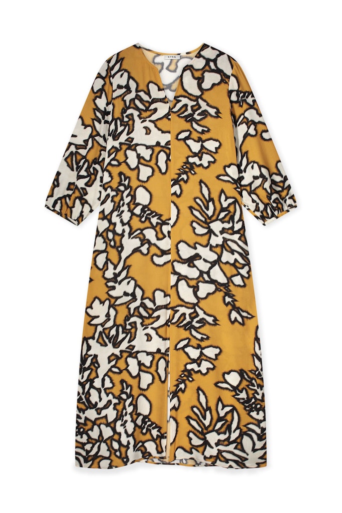 Jurk van Kyra in een all-over dessin met driekwart pofmouwen en een V-hals. Materiaal: Viscose 100%