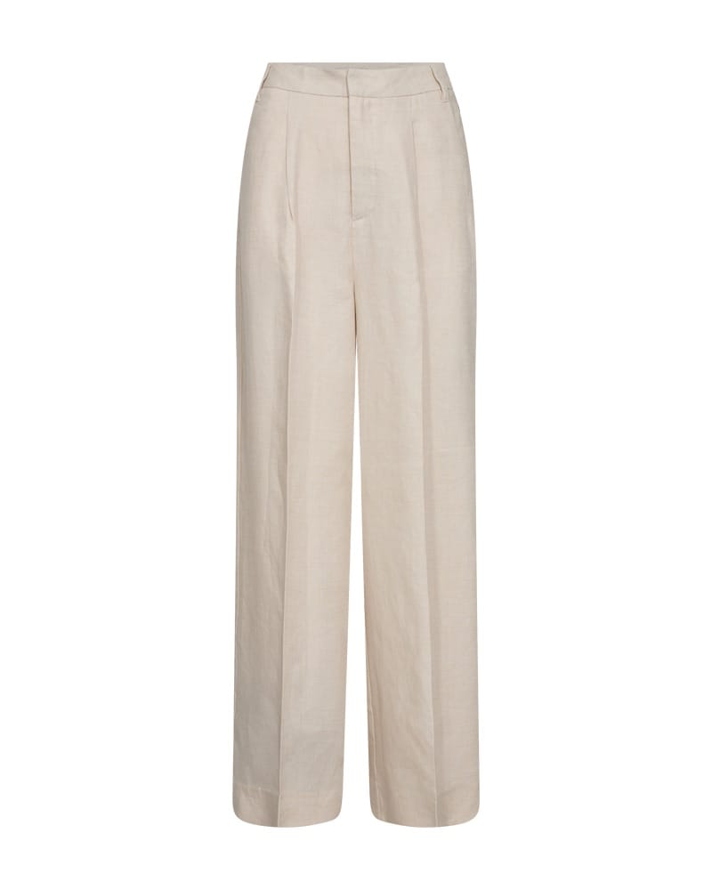 Broek van Copenhagen Muse met wijde pijpen, knoop- en ritssluiting, bandplooien, steekzakken en twee paspelzakken aan de achterzijde.