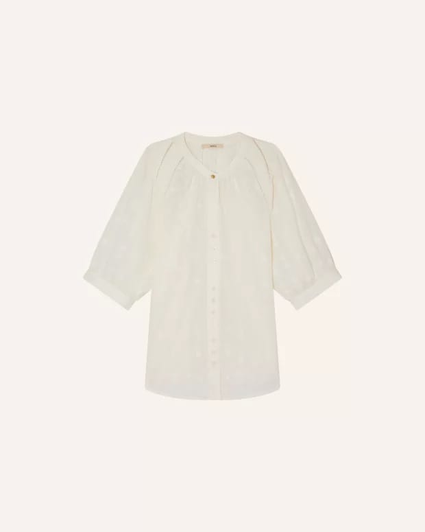 Blouse van Sessun in een all-over dessin met korte pofmouwen, opengewerkte schouders, ronde hals en een knoopsluiting. Materiaal: Katoen 95%| polyester 5%