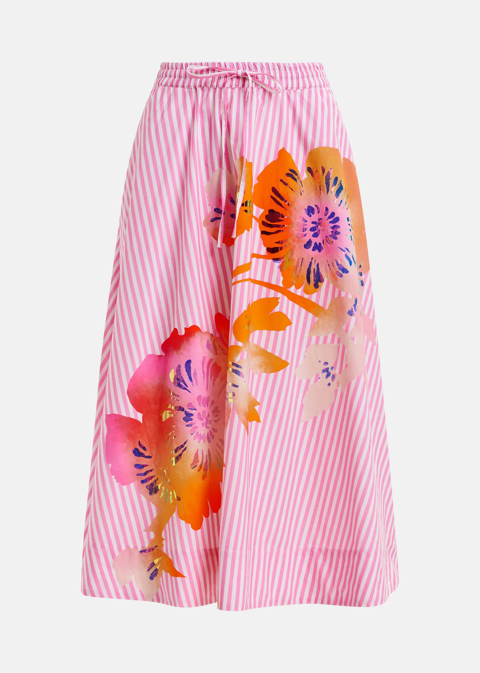 Gestreepte A-lijn rok van Essentiel Antwerp versierd met folie bloemen, twee steekzakken en een elastische tailleband voorzien van trekkoord.