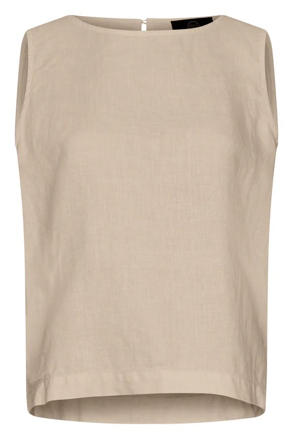 Mouwloze linnen top van HET! Amsterdam met een ronde hals en uitsnede met knoopsluiting aan de achterzijde. Materiaal: Linnen 100%