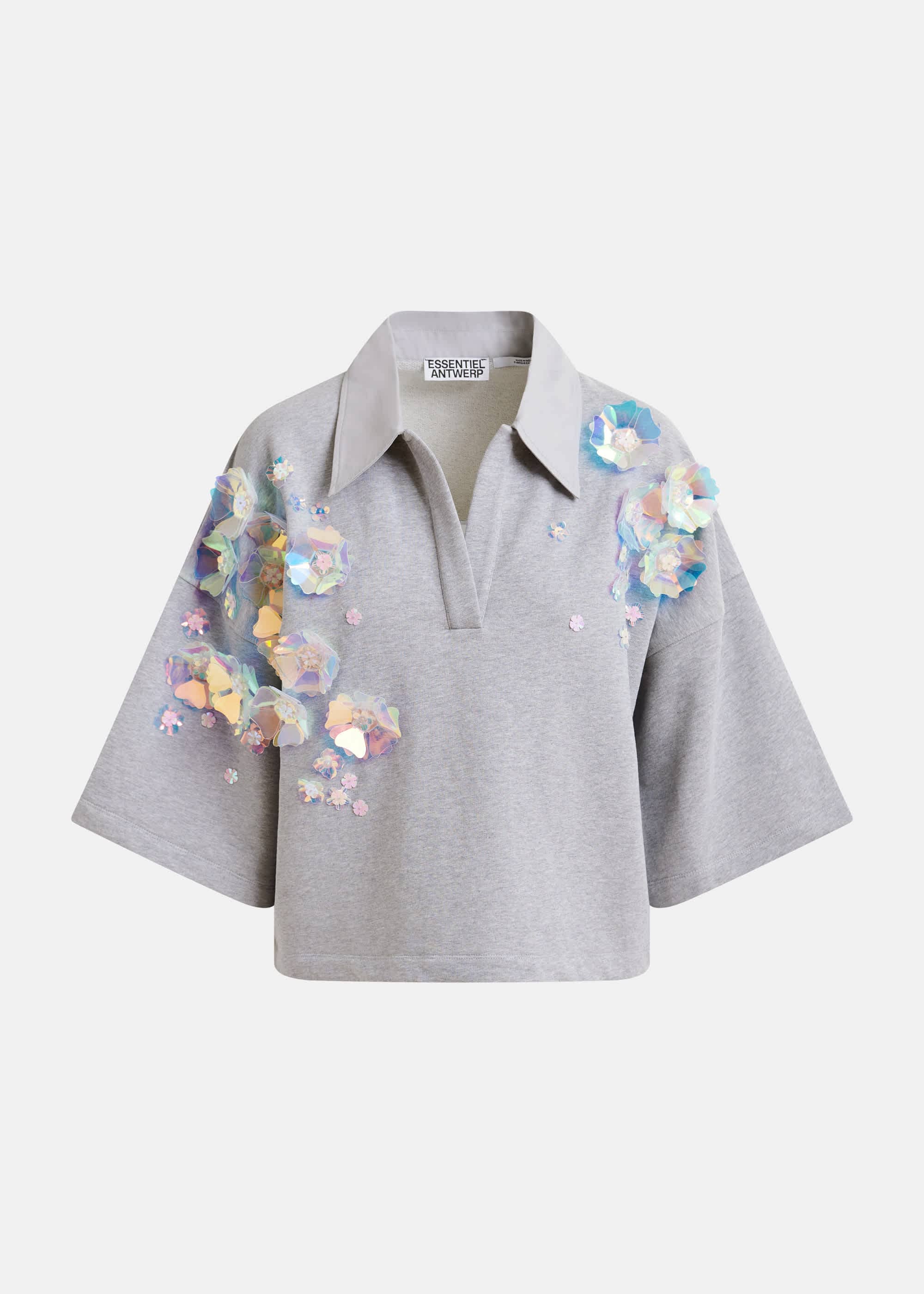 Fijn gebreide polotrui van Essentiel Antwerp met borduurwerk voorzien van pailletten, driekwart mouwen, verlaagde schoudernaden, kraag en een V-hals.