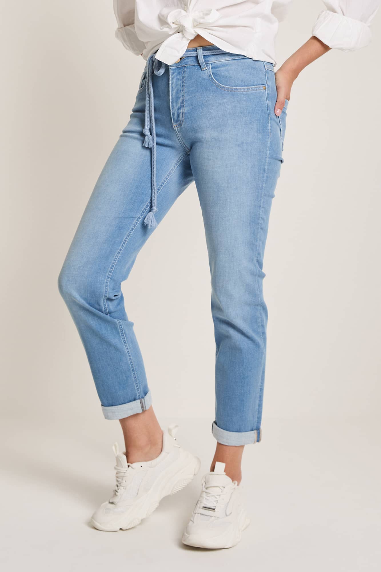 Enkellange 5-pocket jeans van Para Mi met een knoop- en ritssluiting, hoge tailleband, omslag onderaan de pijpen en een strikkoord in de taille. Materiaal: Katoen 92%| polyester 6%| elastan 2%