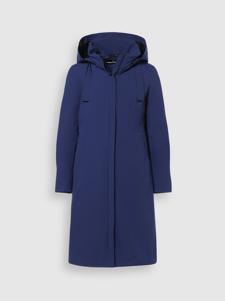 Getailleerde regenjas van Creenstone met een verborgen deelbare ritssluiting, capuchon in de kraag, twee steekzakken en geplooid manchetdetail. Materiaal: Polyester 100%