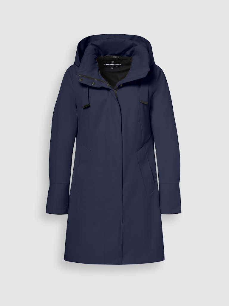 Waterafstotende jas van Creenstone met een verborgen drukknoop- en deelbare ritssluiting, opstaande kraag, opvouwbare capuchon voorzien van trekkoord, steekzakken en een ritssluiting aan de achterkant. Materiaal: Gerecycled polyester 100%
