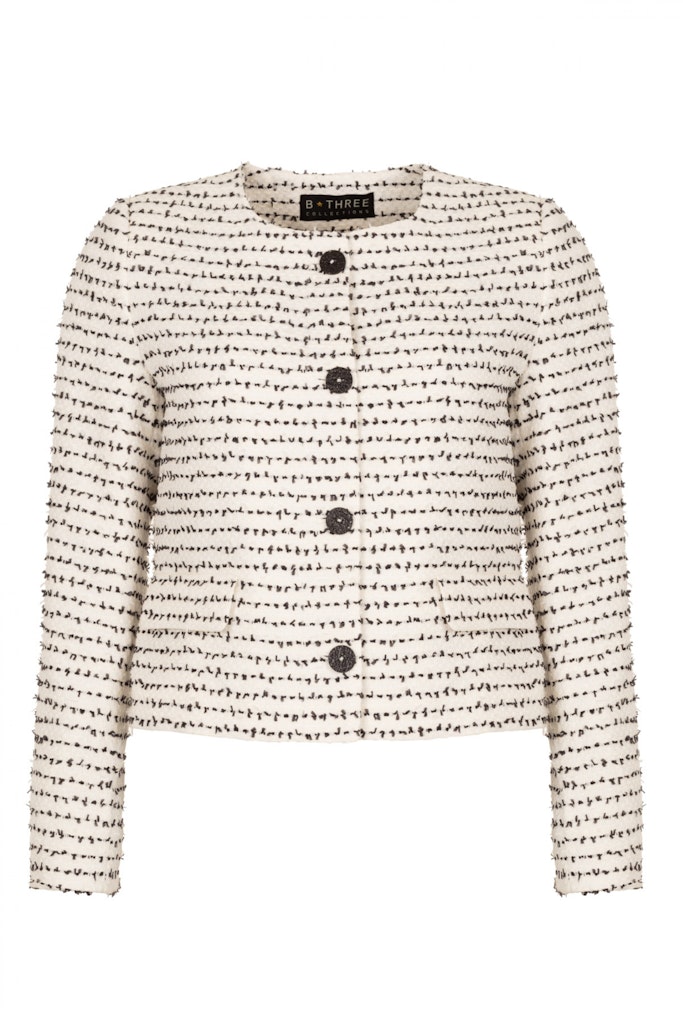 Korte gestreepte blazer van B Three met lange mouwen, ronde hals, knoopsluiting en twee klepzakken. Materiaal: Polyester 59%| katoen 26%| polyamide 15%