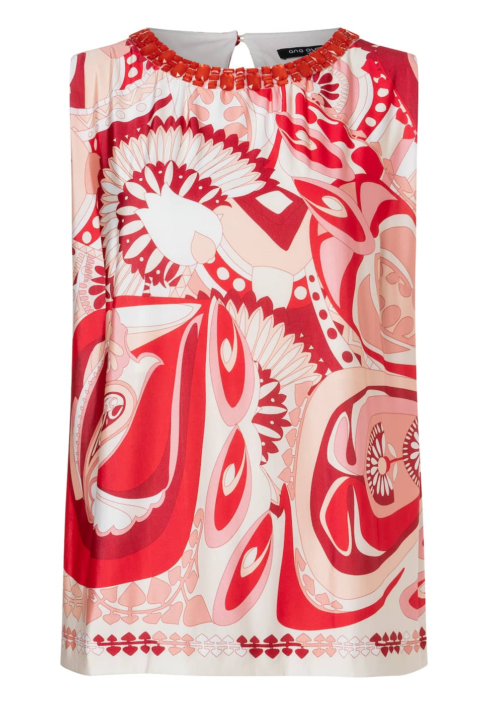 Mouwloze top en broek van Ana Alcazar in een all-over dessin. De top heeft een ronde hals voorzien van sierstenen en een uitsnede met knoopsluiting aan de achterzijde. De broek heeft wijde pijpen en een elastische tailleband.