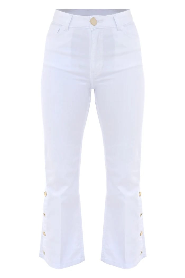 Enkellange, 5-pocket broek van Kocca met een knoop- en ritssluiting en een knopendetail aan de uitlopende pijpen.