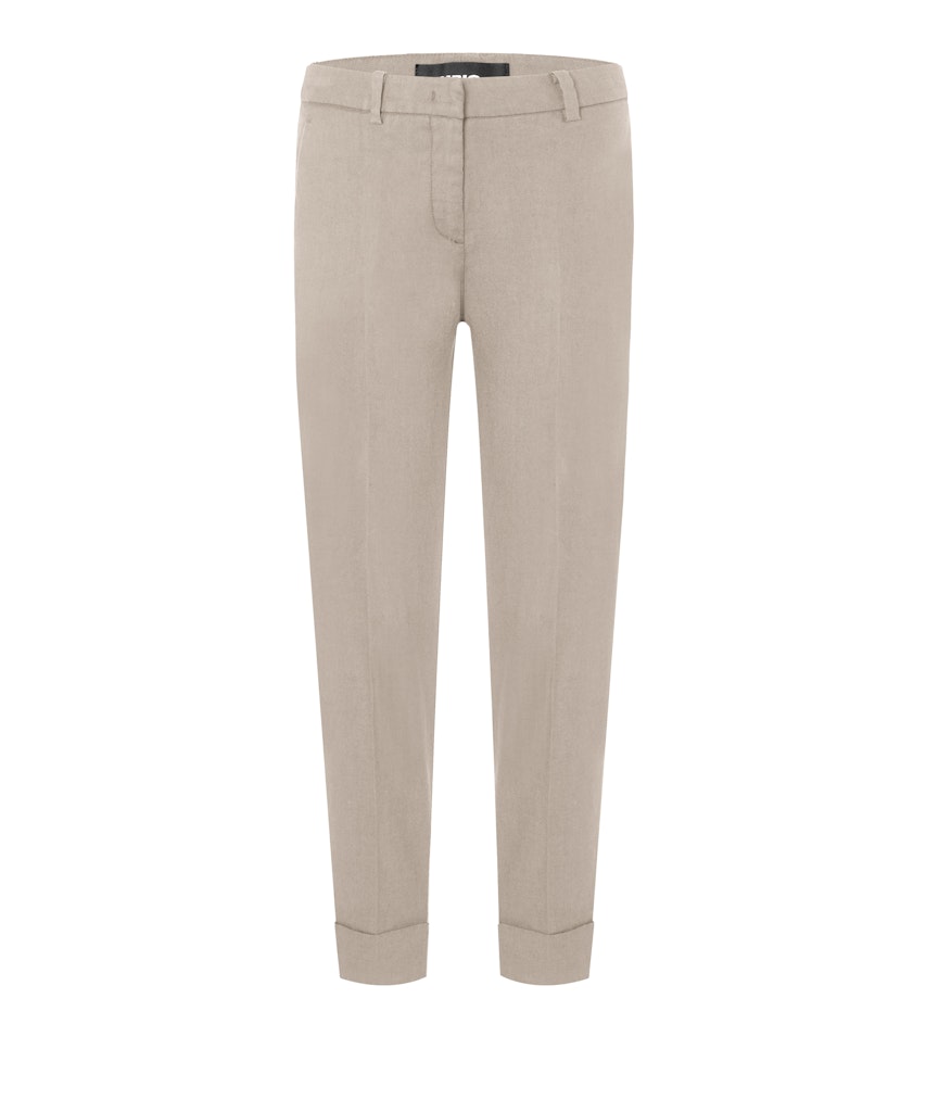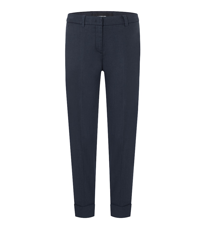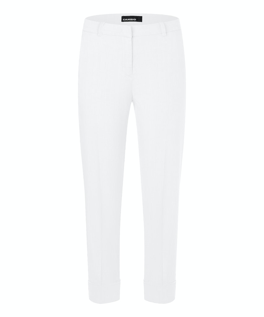 Enkellange linnen broek van Cambio met een verborgen knoop- en ritssluiting, steekzakken, paspelzakken aan de achterzijde en een omslag in de pijpen.