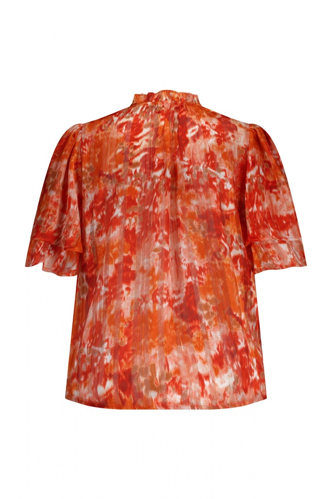 Blouse van Label Dot in een all-over dessin met korte wijde mouwen en een opstaande kraag voorzien van split en striksluiting.