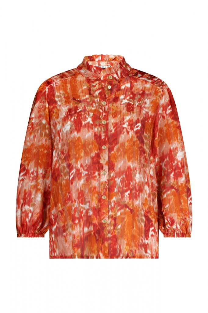 Blouse van Label Dot in een all-over dessin met driekwart pofmouwen, opstaande kraag en een knoopsluiting. Materiaal: Polyester 100%