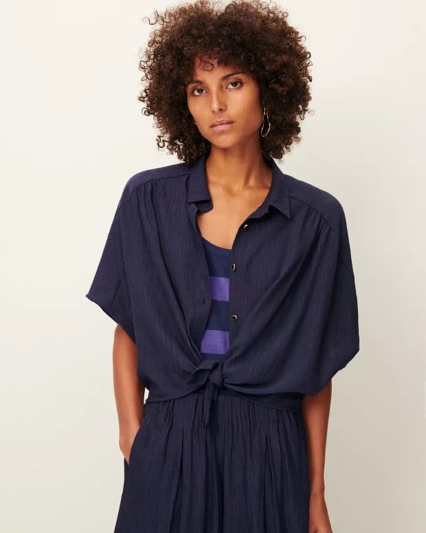 Blouse van Sessun in een structuur dessin met korte aangeknipte mouwen, kraag, knoopsluiting en een strikdetail aan de zoom.