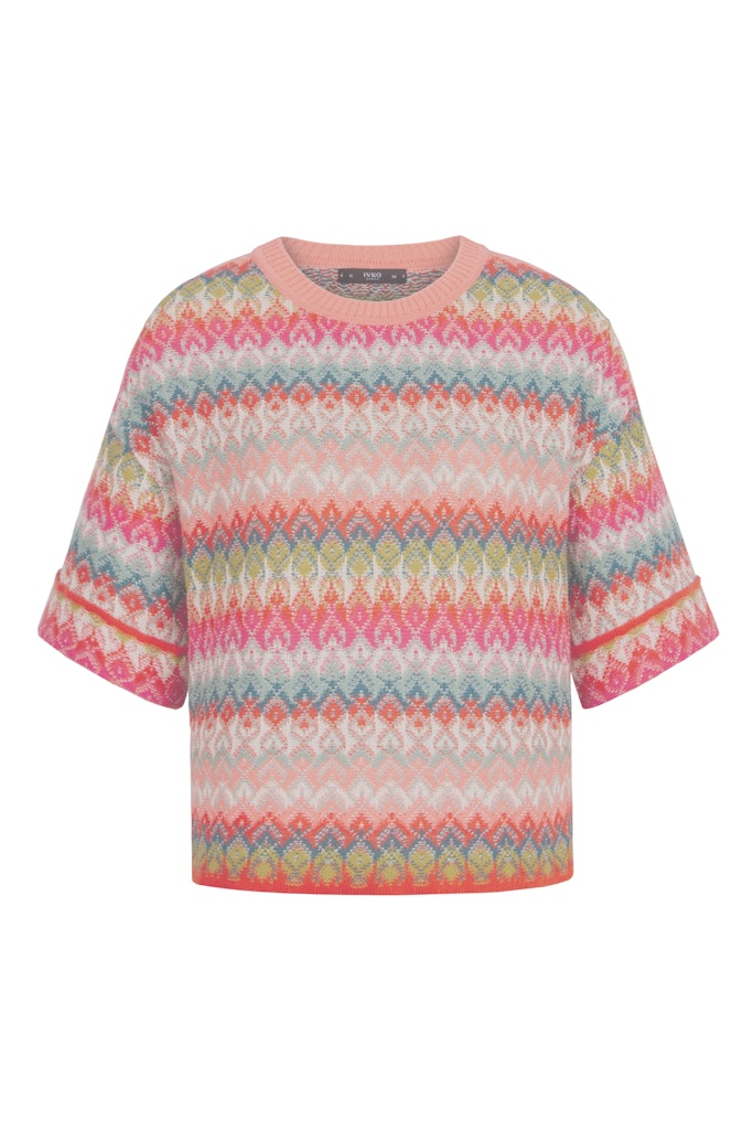 Jacquard trui van Ivko Woman in een all-over dessin met een ronde hals en driekwart mouwen voorzien van omslag.
