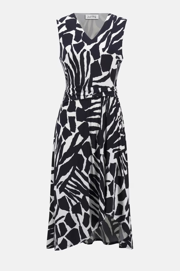 Mouwloze A-lijn jurk van Joseph Ribkoff in een grafisch dessin met een V-hals, getailleerde taille en een split aan de voorzijde. Materiaal: Polyester 95%| spandex 5%